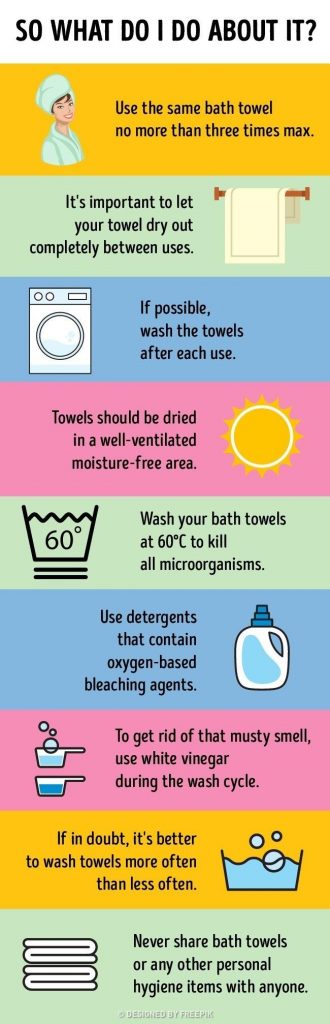 - Most importantly, make sure your towels are dried in the sun so they are always dry before and after use.